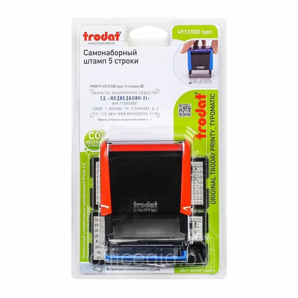 Самонаборный пятистрочный штамп Trodat 4913DB прямоугольной формы. В комплект входят прочная пластиковая оснастка с прямоугольной рифленой пластиной, встроенная сменная подушечка синего цвета, пинцет, касса символов высотой 3,1 и 2,2 мм. При помощи пинцета знаки из кассы вставляются в пазы рифленой пластины в зеркальном отражении Самонаборные штампы прямоугольной формы применяют для набора информационных, адресных, маркировочных штампов. При изменении информации достаточно просто поменять символы на другие.